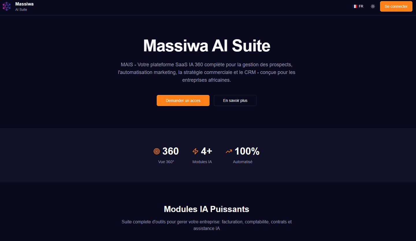 Une suite SaaS tout-en-un pour centraliser CRM, facturation, pré-comptabilité, marketing, SIRH et conformité OHADA, entièrement pilotée par l’IA.