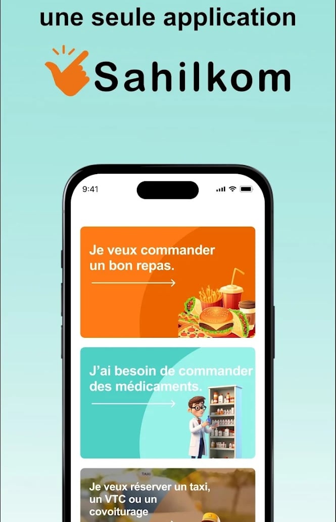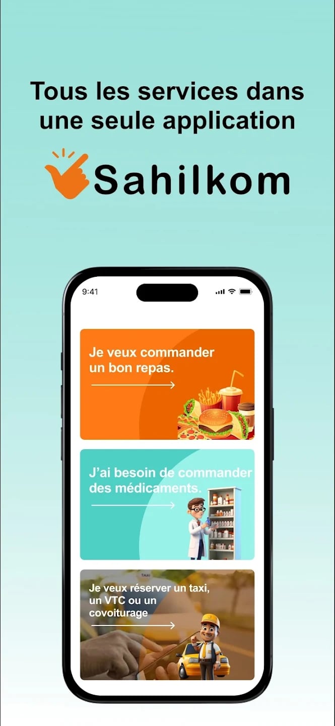Sahilkom, l'application aux Comores pour VTC, taxi privé, covoiturage, livraison repas et médicaments à domicile, hébergements, excursions et événements.